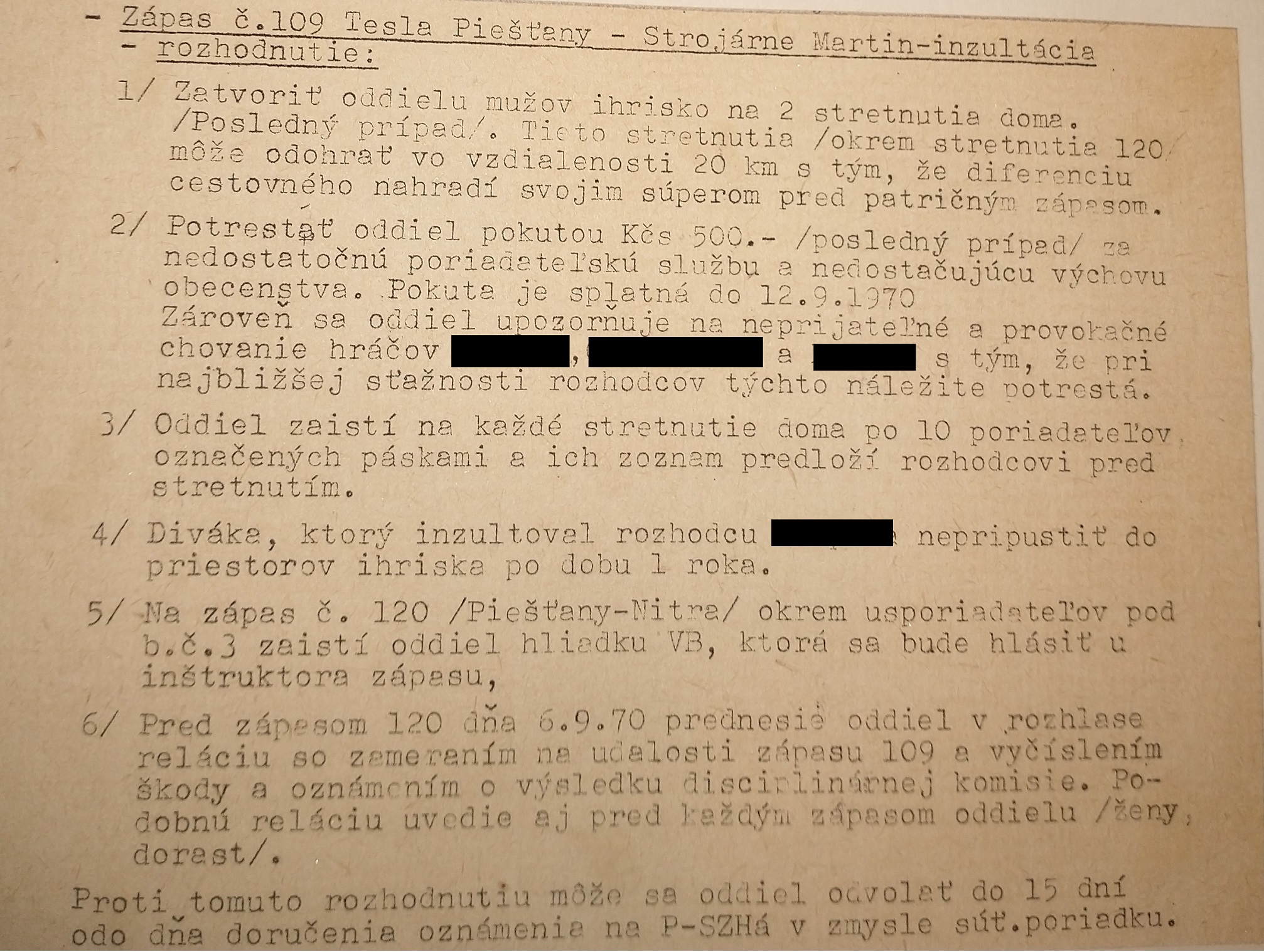 „Deň 23.8.1970 sa zapíše do dejín piešťanskej hádzanej ako ‚čierny deň‘. Po majstrovskom stretnutí II. ligy mužov Tesla Piešťany – Strojárne Martin 13:14 ( 5:6 ), došlo k i n z u l t á c i i rozhodcu xxx z Partizánskeho.